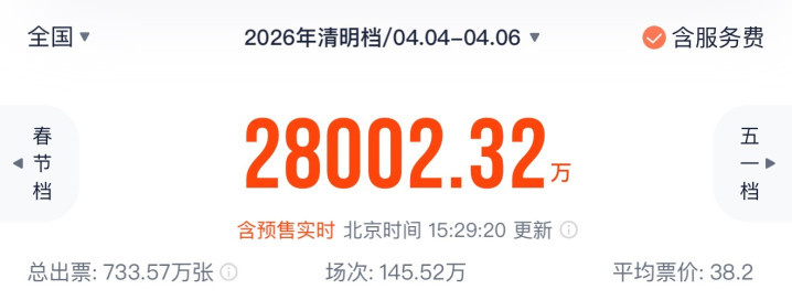 据网络平台数据,截至今日15时29分,2026年清明档档期(4月4日—4月6日)电影票房(含预售)突破2.8亿元。